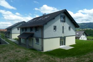 Ce projet de villas contigües, situé sur une magnifique parcelle proche d’Oron-la-Ville, a été exécuté en 3 étapes. Un groupe de 5 villas contigües avec parking souterrain a été construit dans la 1ère phase. Dans un 2ème temps, un groupe de 6 villas contigües (également avec parking souterrain) a vu le jour. Et pour terminer, 2 groupes de 2 villas mitoyennes ont complété cette résidence. Ces villas orientées plein sud, face au Mont-Blanc, sont sur 4 niveaux. Elles possèdent chacune en sous-sol, une salle de jeux – au rez, une cuisine ouverte sur le séjour et un wc visiteurs – à l’étage 3 chambres et 2 salles d’eaux – aux combles, une grande pièce aménagée qui peut servir de chambre ou de bureau.