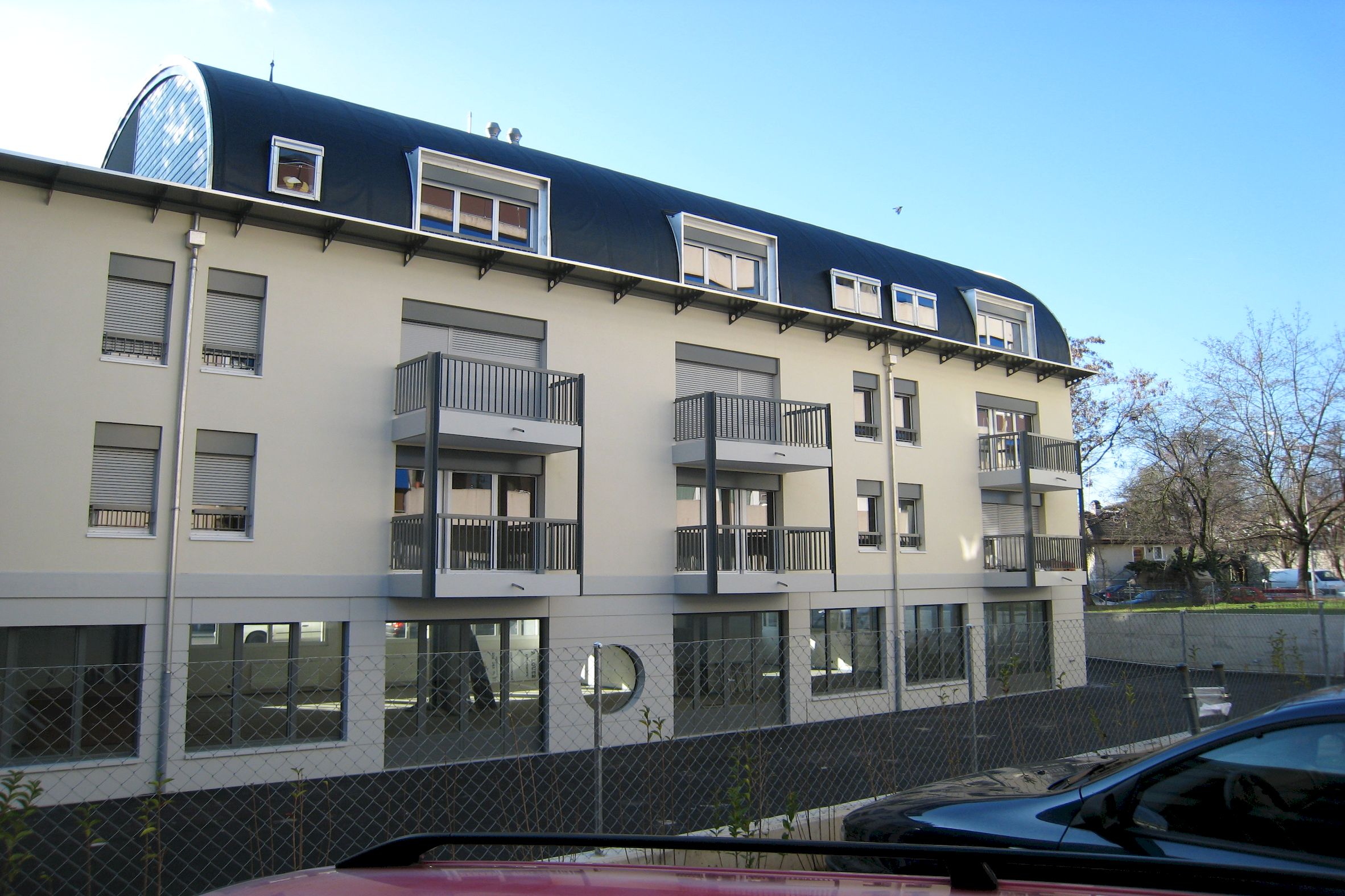 Sur une parcelle qui été occupée autrefois par une menuiserie-charpente, ont été construits 2 immeubles abritant 11 logements locatifs, 4 surfaces de bureaux, 2 dépôts et un parking souterrain.