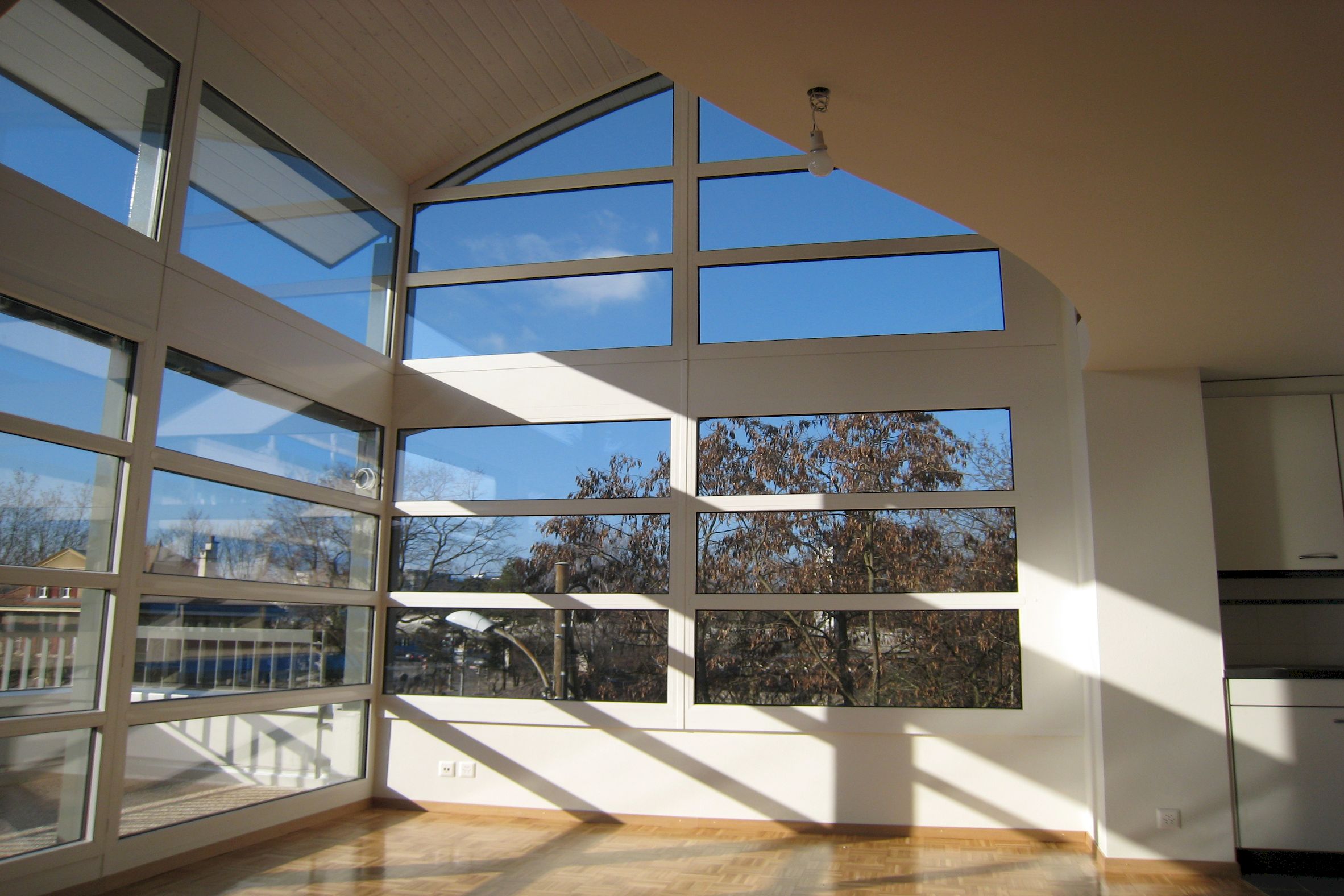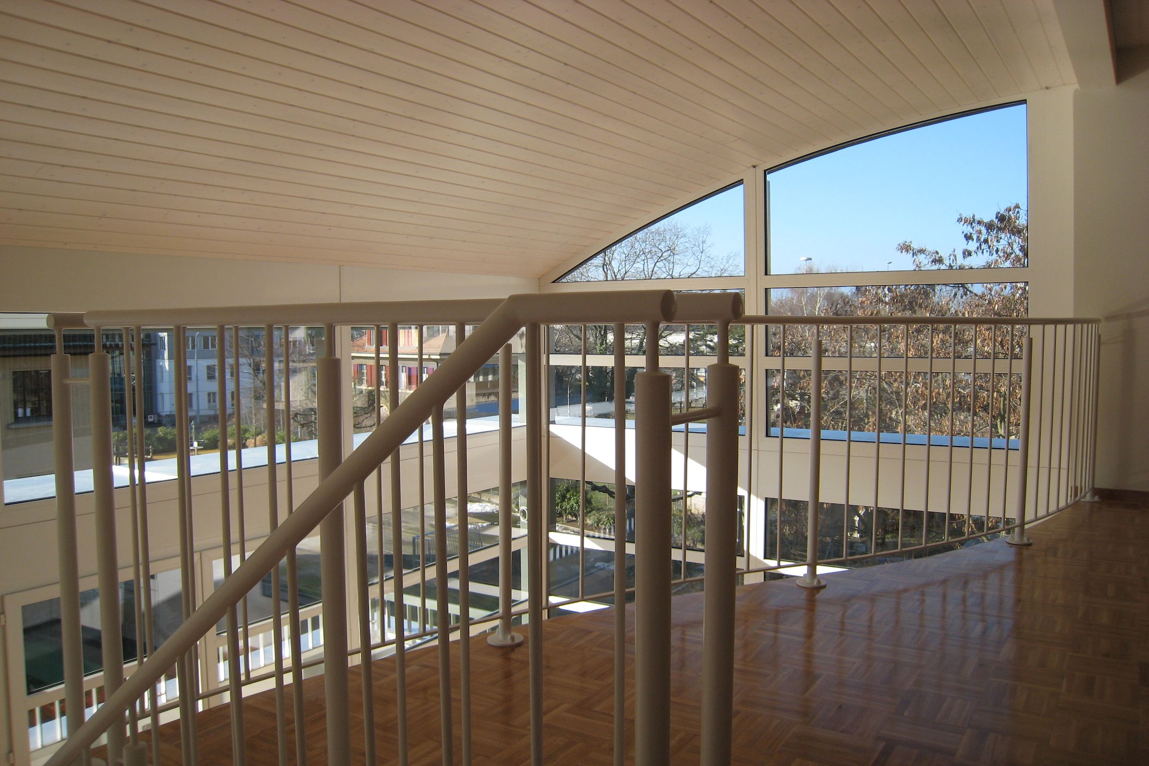 La toiture arquée constituée d’une charpente en bois avec une isolation entre chevrons, d’une sous-couverture traditionnelle supporte une couverture – étanchéité en caoutchouc EPDM à soudure thermique. Cette couverture est d’ailleurs une première en suisse romande.