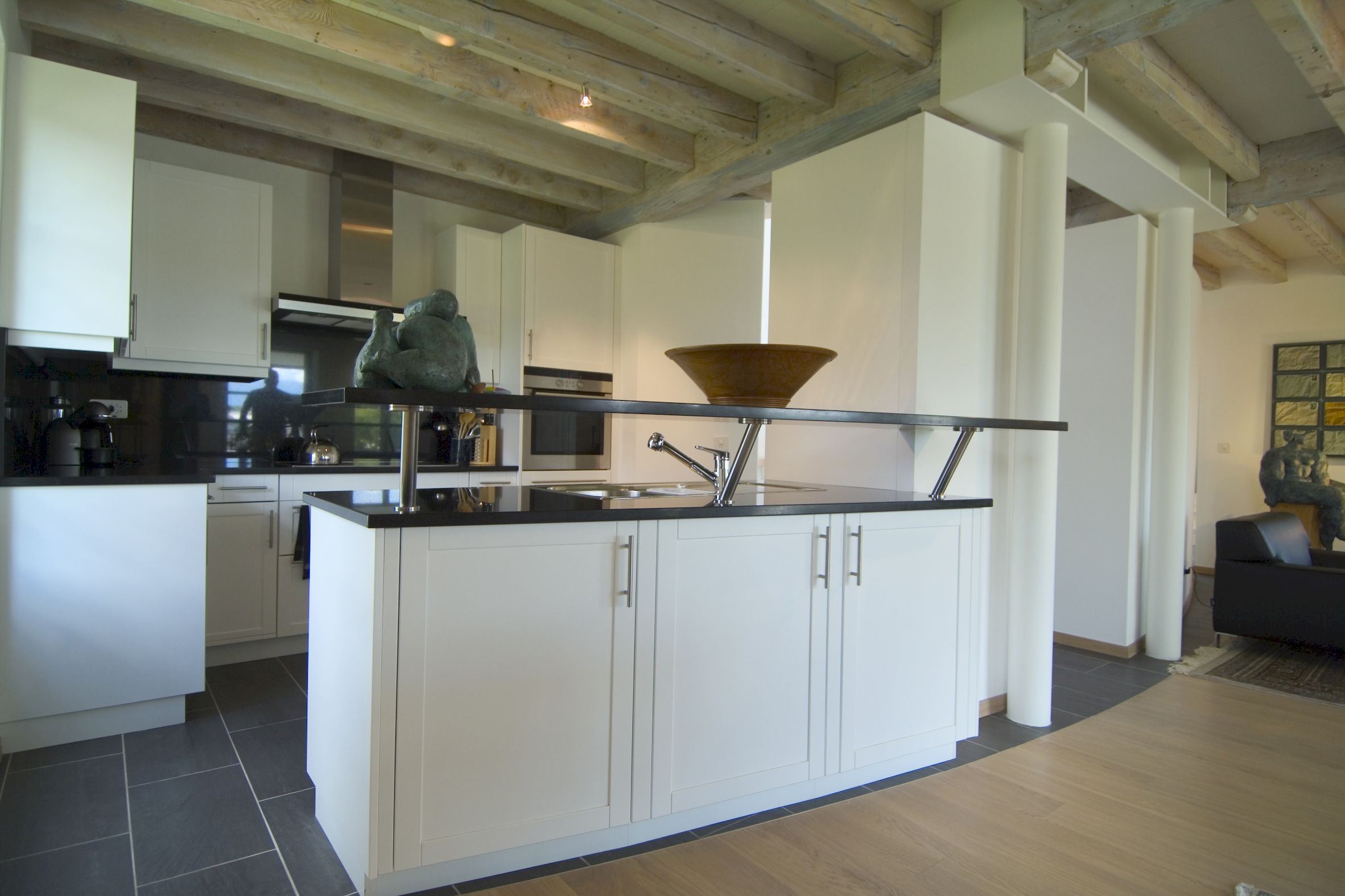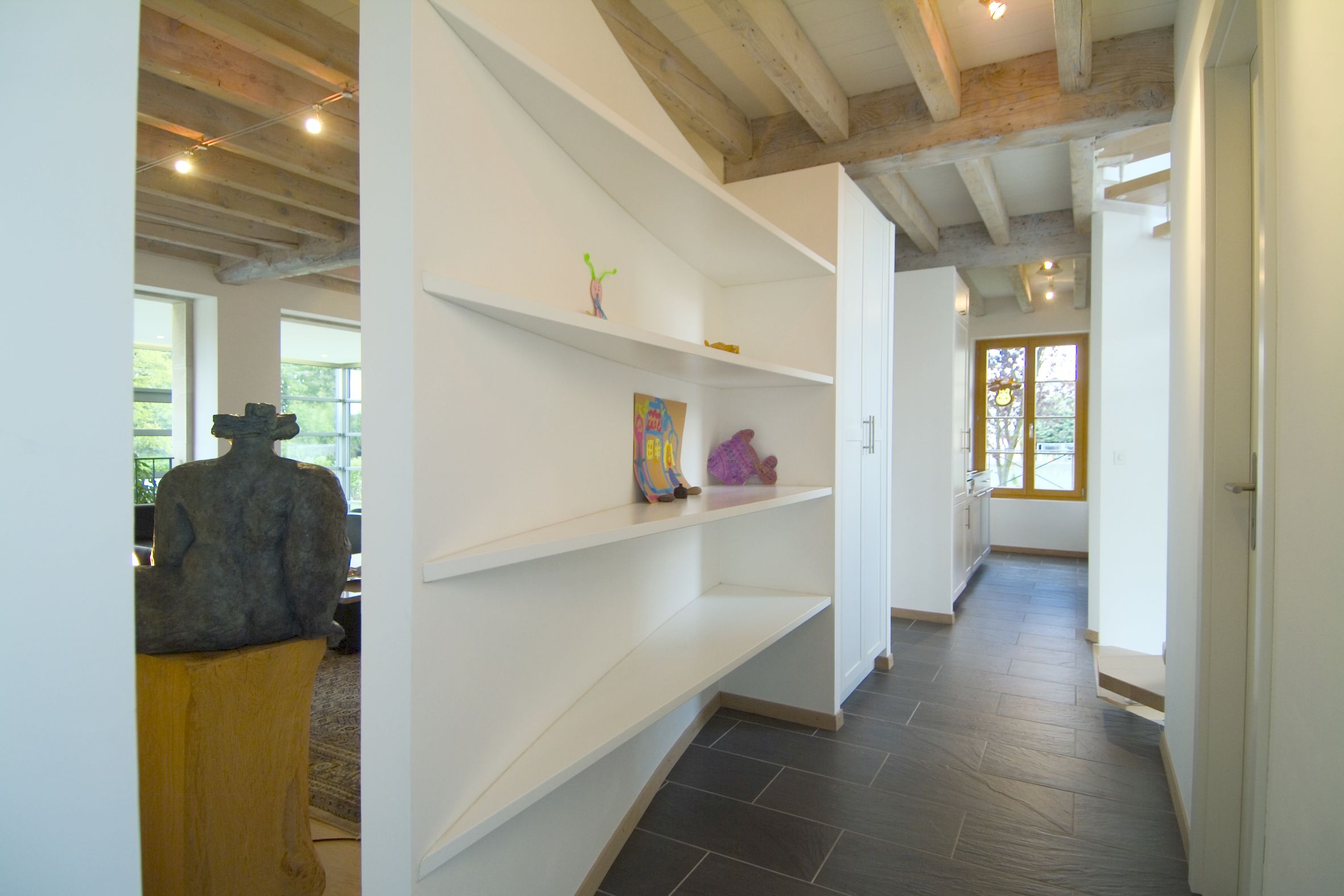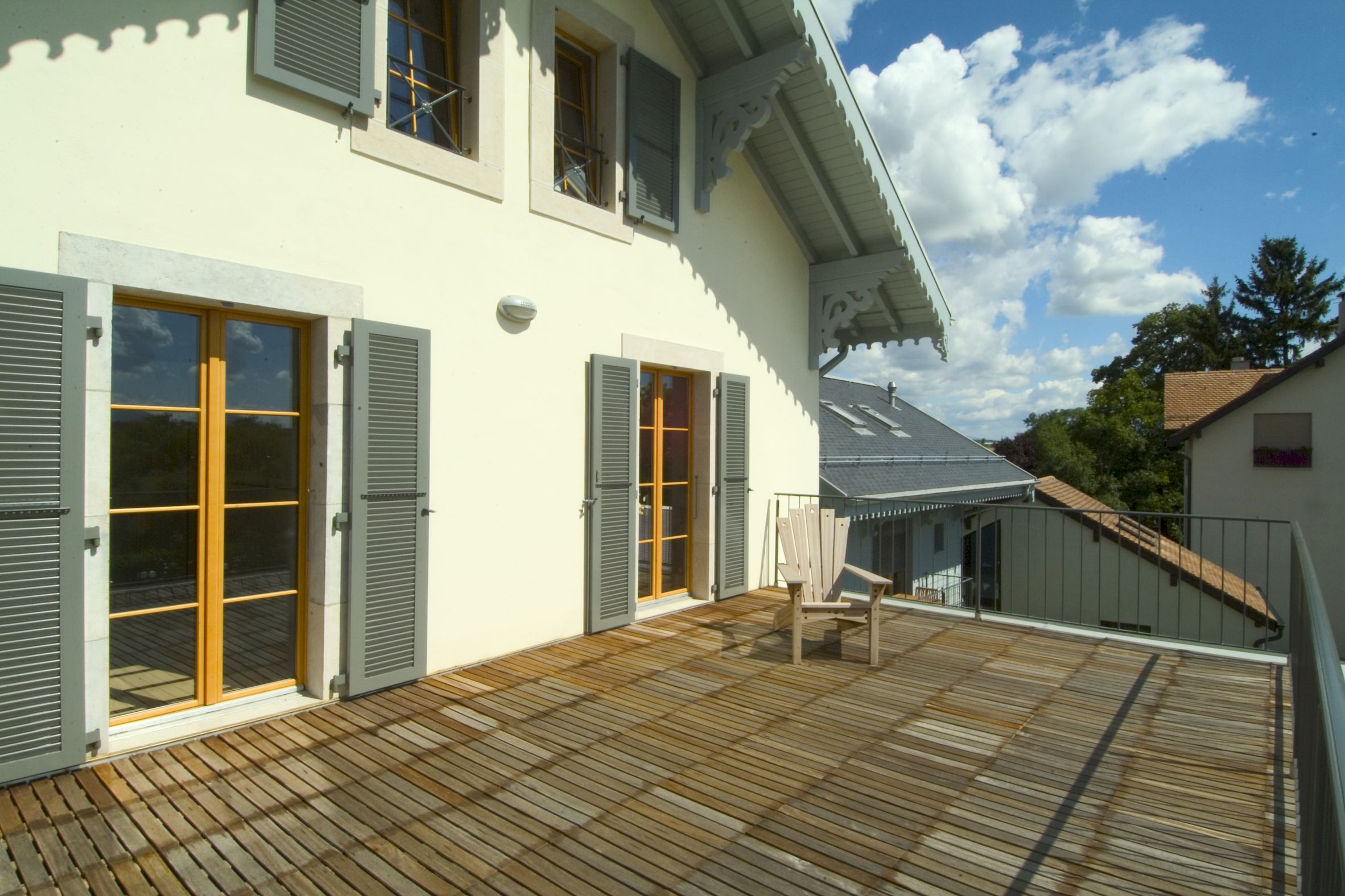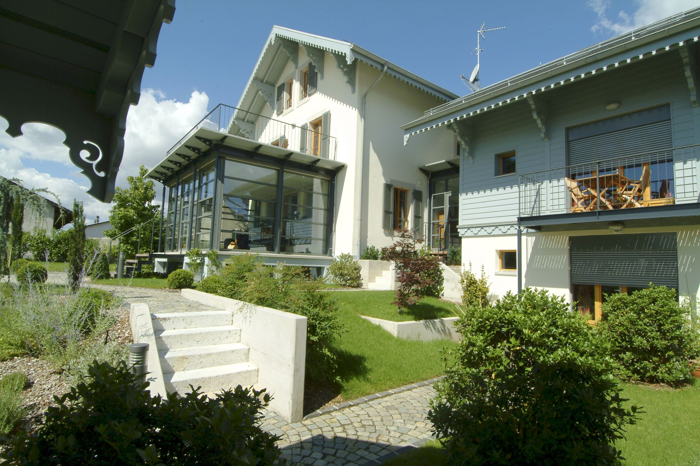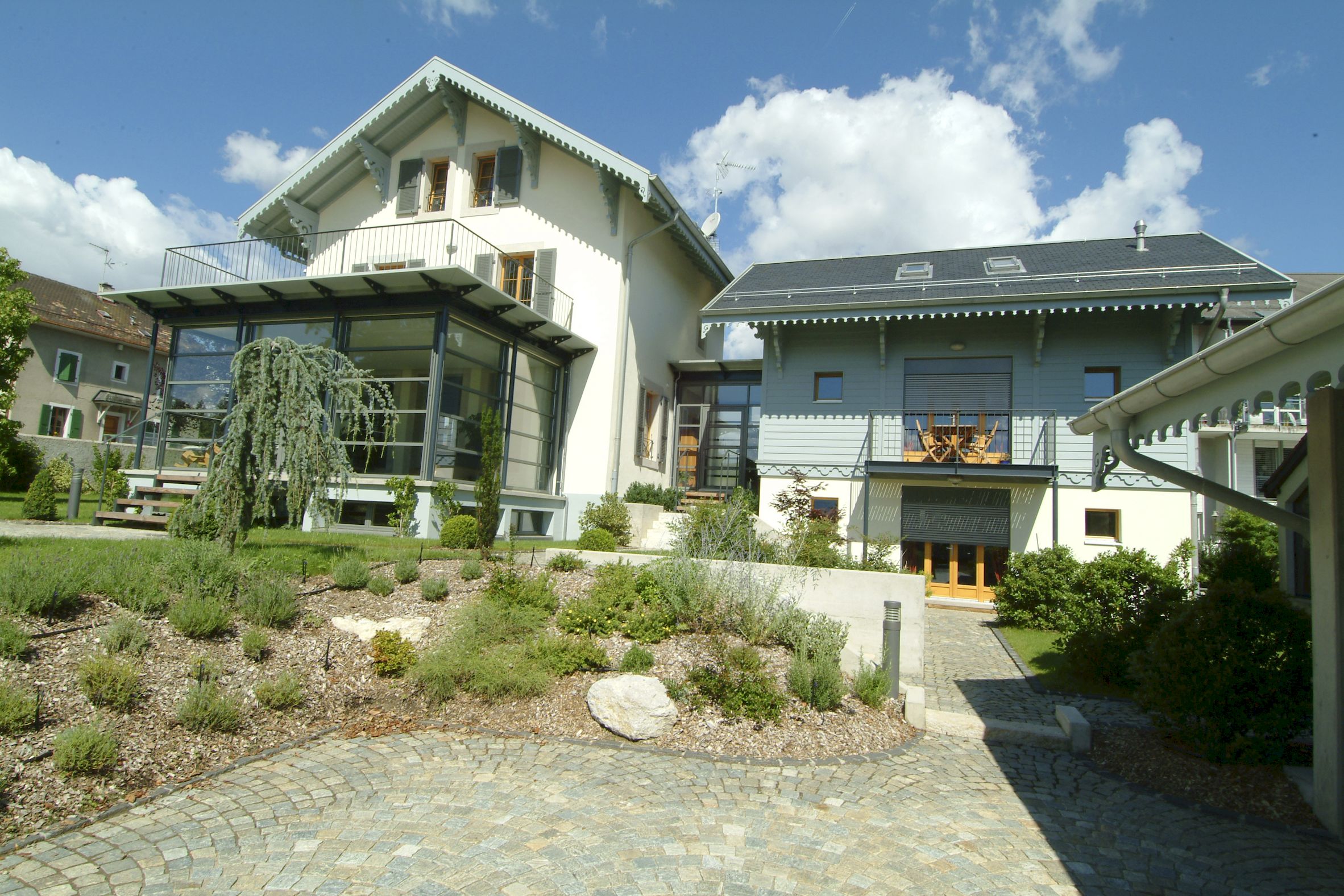 La maison existante, l’annexe ainsi que le couvert à véhicules ont été réalisés « à l’ancienne » en opposition avec le jardin d’hiver, l’élément de liaison et les cages d’escaliers ont été traité d’une façon résolument contemporaine. L’ensemble des pièces de charpente ainsi que les éléments de décors extérieurs ont été conservés ou refait à l’identique afin de préserver l’aspect originel de la construction.