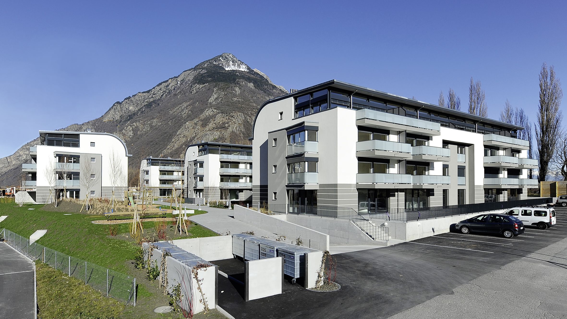 Ces bâtiments répondant au label Minergie, ont été conçus de façon à ce que les véhicules soient directement dirigés au sous-sol, laissant toute la surface du rez-de-chaussée piétonne et supprimant ainsi toutes les nuisances liées aux voitures.